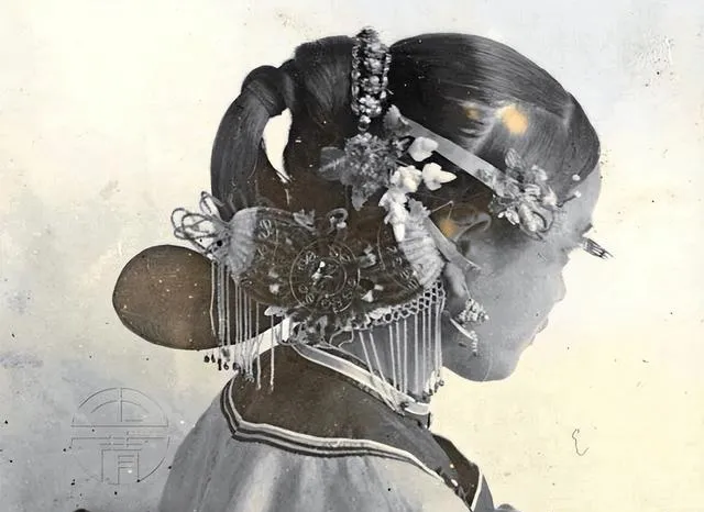 图中这头饰叫步摇发髻,漆黑的发髻盘得圆润,银制花片一层压一层,流苏细细垂下来,走一步就轻轻颤,奶奶说当年女儿家出门,簪花不光是好看,也是体面,花片多一片,心里就硬气一分,现在发夹一包十来个,样子倒是多,少了那点讲究。