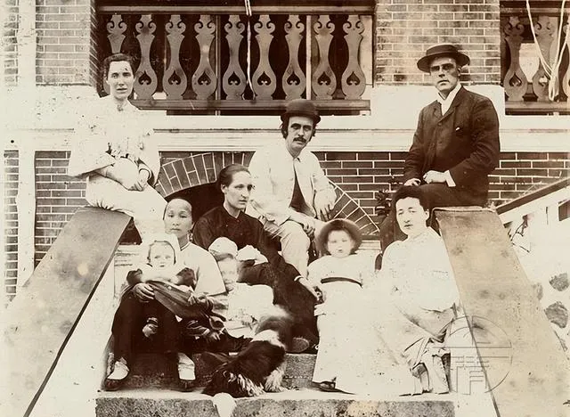 这张是骑楼台阶合影,衣料款式杂糅,木帽草帽都在,后面的砖拱和雕栏新得发亮,海风一吹,商路带来的新鲜玩意儿就跟人挤在一块儿了,那时候泉州真会混搭,现在我们说混搭是潮,那会儿他们是日常。
