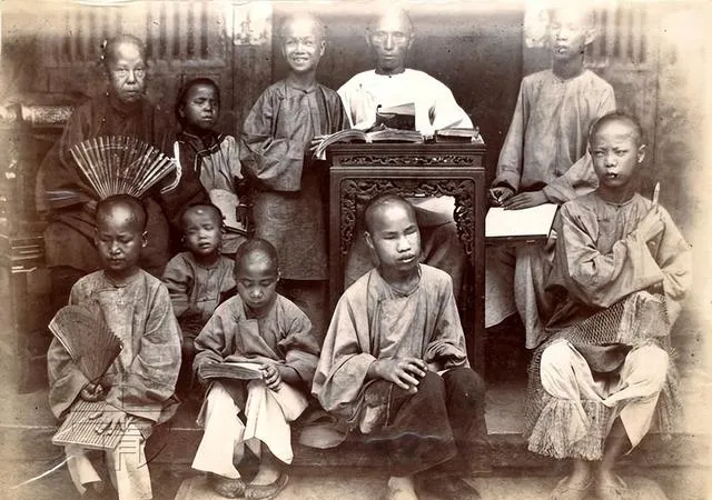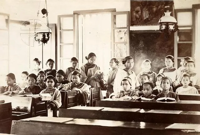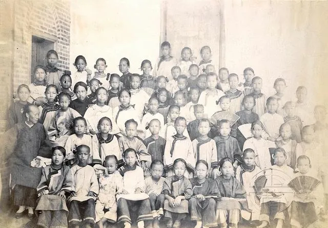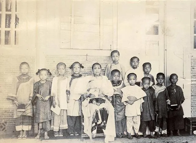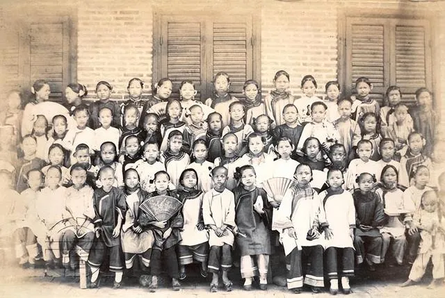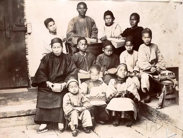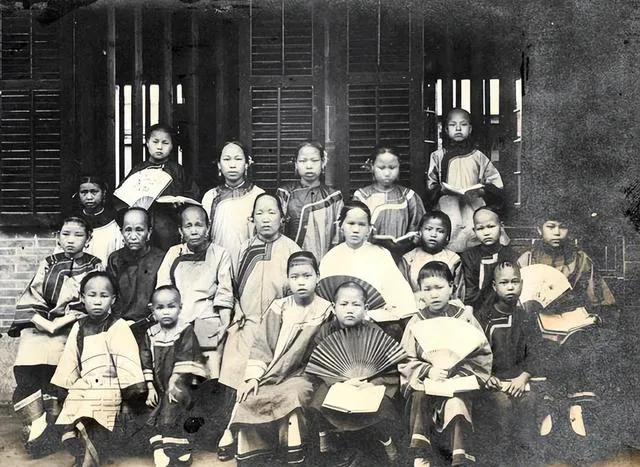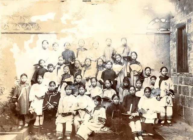 这一看就是女塾小班,窗棂深色,孩子手里捧着书,扇子当书签,靠前的小姑娘抿着嘴,像是在背诗,老师坐中间不多话,眼神却把队形拢住了,想来那堂课点名用的还是闽南语呢。