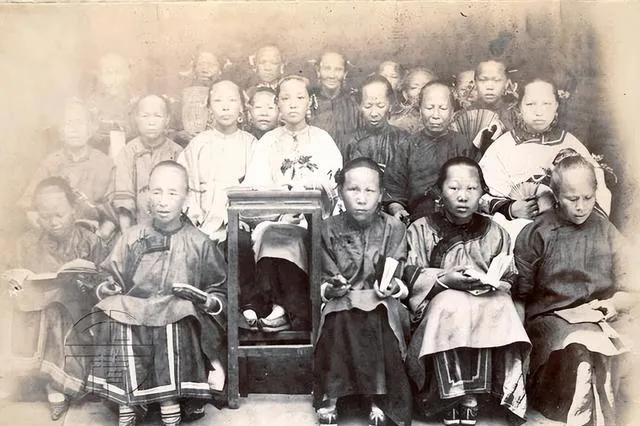 这排人站在牌匾下,是女学堂合影,小脚大袖并排坐,扇面遮一半脸,老师扶着书册,眼神有光,外婆讲她年轻时识字少,看这种照片就打心里服气,现在孩子背着书包嫌重,那会儿只要能进堂,风吹雨打都愿走。