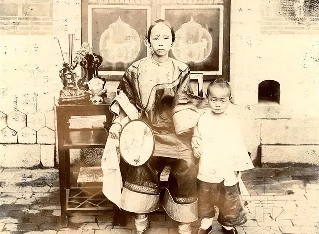 这张叫母子照,圆框镜面摆在桌上,檀木格架上供着香炉花瓶,孩子抓着母亲的手,眼睛直直看镜头,一点不怯,家里话常说,孩子胆大走路就早,这眼神里分明有股闽南骨子里的倔。