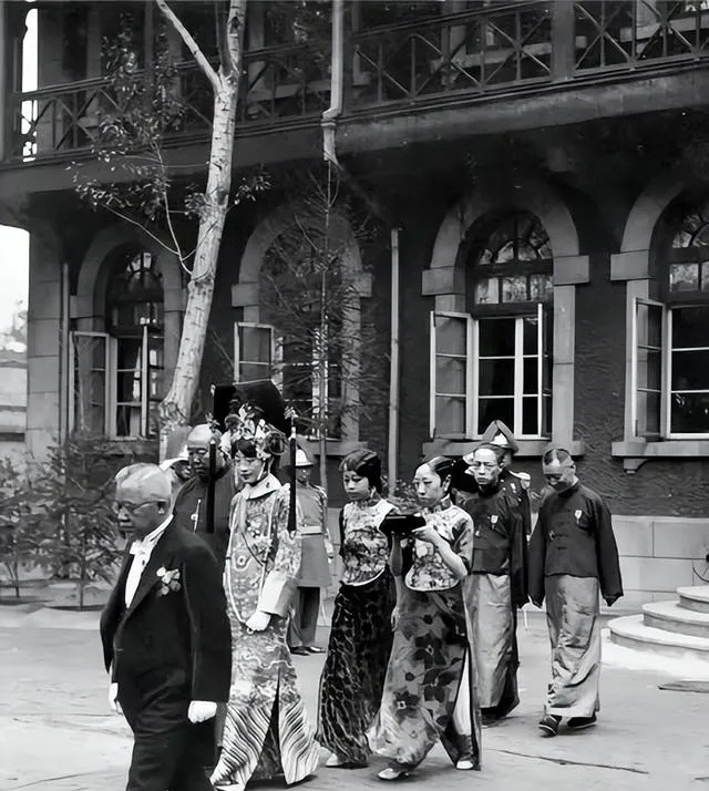 这个场面气派,凤冠旁边是西式礼服,后头跟着旗袍和长衫,石板路干净得能照人,扛伞的小太监步子跟得紧,前面开道的人夹着白手套,转过楼角的时候,楼上的窗正好半开,像是有人探出头看热闹。