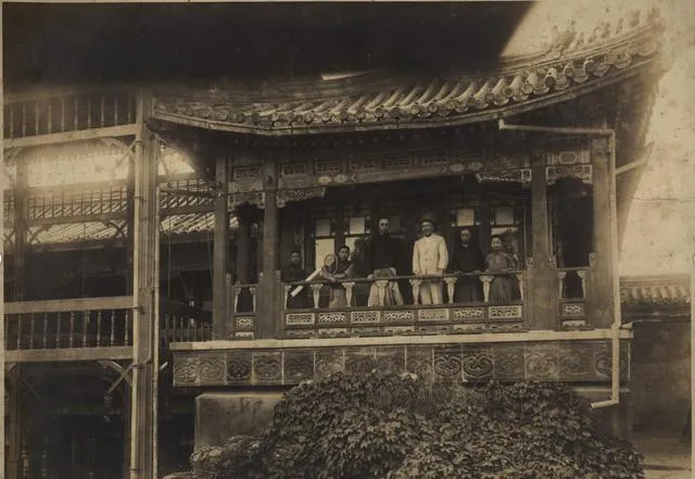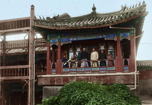 这座小楼叫养性斋,屋檐下彩画还亮着,栏杆外头倚着几个人,西装长衫混在一起,一个人手里夹着薄册,好像刚讲完一段英文单词,另一个把手搭在栏板上看院里的风,屋角那根立柱微微斜,像是赶时间搭起来的,楼下的爬山虎一片油绿,把木阶的缝都填满了。