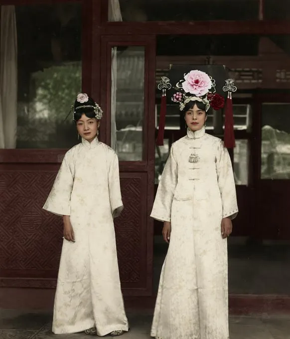 小时候我家墙上也挂过两位穿白旗装的照相馆彩照,姥姥总说白衣最显人精神,可别靠近烟火灶台,一靠就黄一圈,听得我只敢远远看。