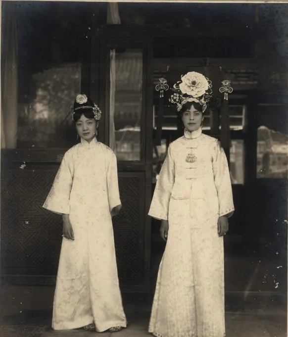 这张安静,两个人并排,右边那位戴大挑,挑面上压一朵大粉花,垂穗落到肩头,左边那位只在鬓间插一朵小花,手自然垂着,裙摆在地上拖出一点儿折线,身后是木门和窗棂,玻璃里反着院子的树影。