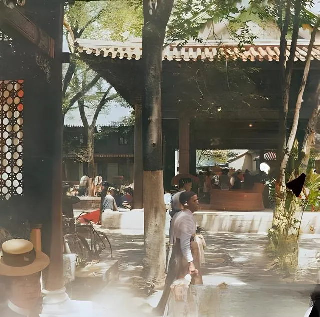 这个有遮檐的院落叫使馆区的内院,树荫把光切成一格一格,人们挤在阴影里打盹儿也好发呆也好,桌案上是随手放的帽子,墙根靠着几辆细轮的自行车,木柱油光泛旧,风一吹,纸扇哗啦啦响,孩子趴在水台边伸手捞影子,屋檐下的女眷把阳伞撑成一朵暗绿色的花,妈妈说当年城里热到冒烟,院里的井水甜,大家轮着打水,谁也不敢走远,外头的枪声一响,整个院子像被拎住了脖子,只能缩在一团,以前日子慢得像扯面,现在消息快得像电火花,恐惧倒是一样快。