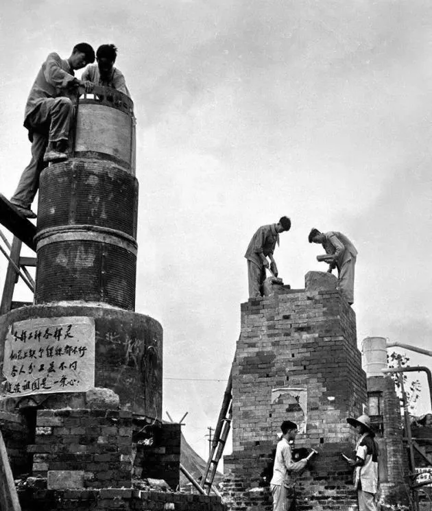 这个红砖砌成的大肚子炉叫小高炉,外头用铁箍勒着,像系了几道腰带,砖缝里抹着泥,手摸上去粗糙得很,师傅们踩在木梯上往上码砖,脚下吱呀响,谁都不戴护具,就这么攀高作业,说实话,看着替他们捏把汗。