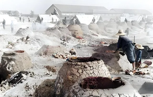 这片开阔地搭着数不清的炉,像一群泥葫芦躺在河滩上,风一吹,旗子哗啦啦,最吵的是铁锹刮渣的声儿,尖利又脆,太阳一大,炉口边泛起白光,把人照得眯着眼,谁也舍不得停。