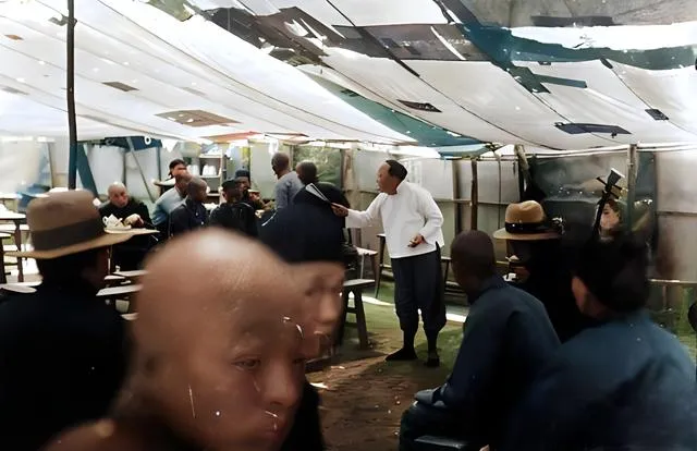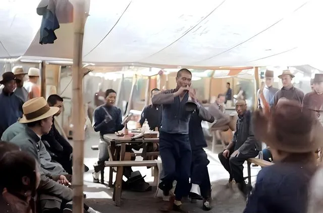 图中这大块篷布叫茶棚,竹竿撑起骨架,粗绳子一勒,四面围着草席和木板,里头摆的是长条板凳和矮方桌,桌上茶盏皮纸灯壳子一应俱全,风一过,棚布微微打颤,滴下来的不是雨,是戏文和笑声,老人说,能进棚子说书就已经比光撂地强点儿,遮风挡雨,还能收点茶钱,掌柜在门口收票根,喊一句坐满了往里挪挪,立刻就挪出一条过道。