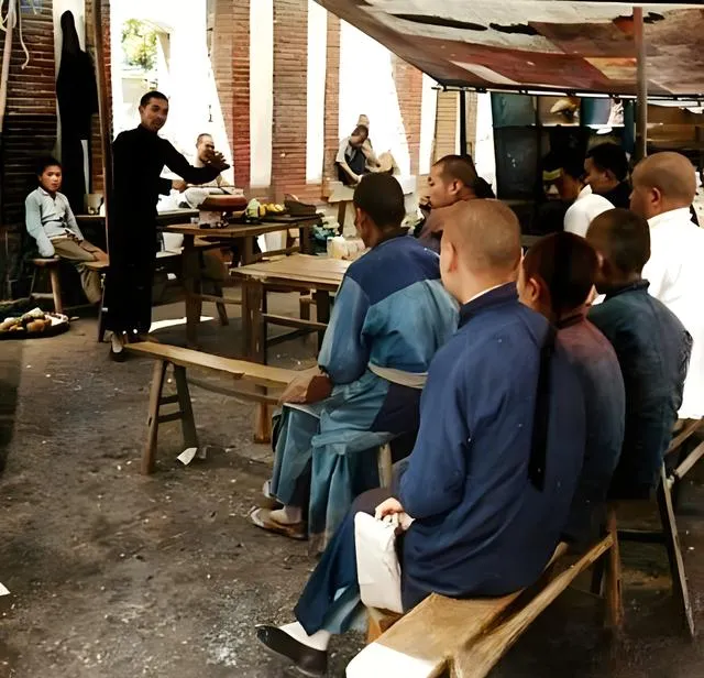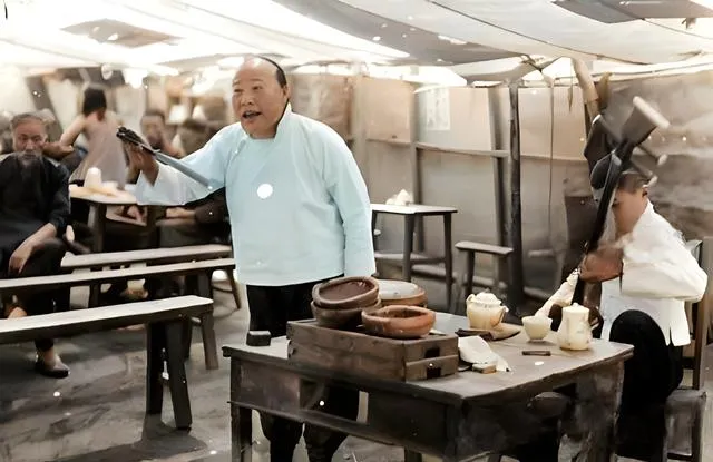 图中这一桌叫相声台子,桌上一摞茶碗一摞手绢,还有半截扇子当道具,扇骨露风,角儿一搭嘴,抖个挫劲儿,别看桌破,一张桌子一张嘴,一片屋顶就能是剧场,那时候相声多对着穷人说,活儿得猛点辣点,包袱里掺点荤素,才有人买账,现在在剧场里规矩多了,讲究干净利落,过去嘛,能把人逗笑就是王道。