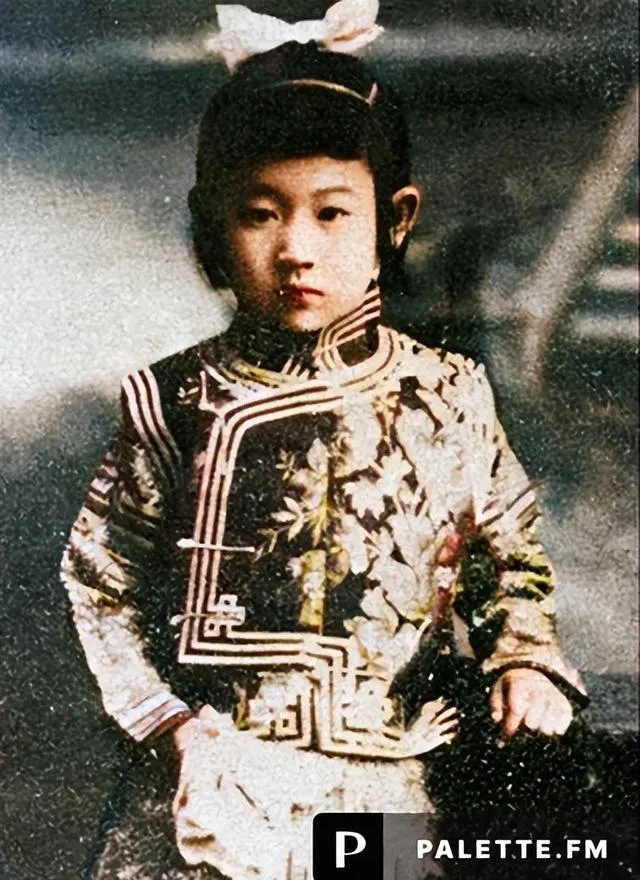 图中这身小旗袍叫大襟短打,缎面底子上压着团花纹,衣角处的滚边绕成几道曲折线,别看人小,站姿却很硬,手插在兜里,眼神有点冷,像被大人摆好了说别动,小时候家里翻老照片也常见这种姿势,摄影师一喊好就僵住了。