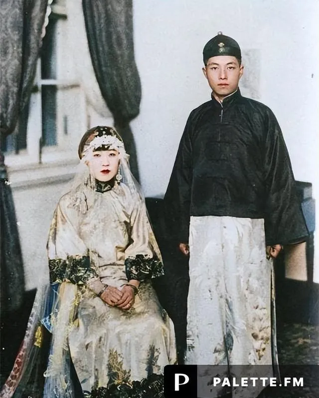 图里这身金丝绣面盖头叫凤冠霞帔的简易版,新郎穿的是立领长衫配马褂,站得直直的,屋里窗帘厚重,光从侧面斜斜打过来,像是冬天的冷太阳,婚照在那个年代多半是父辈一句话拍板,感情不够,礼数来凑。
