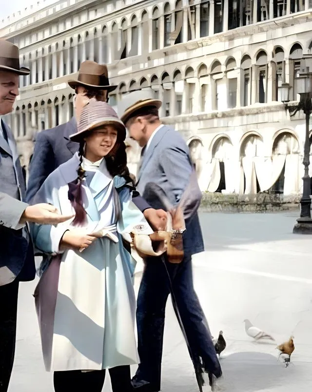 民国名人彩色老照片:在欧洲喂鸽子的林徽因;阎锡山两张家庭照。