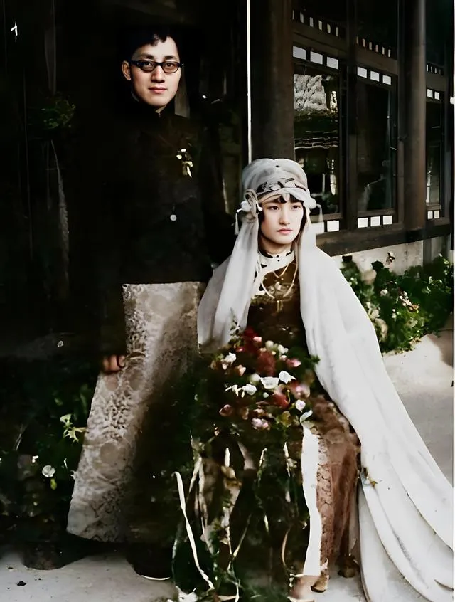 这个新娘服叫中西合璧的时髦打扮,里层是贴体的暗金底绣花长裙,外头罩着垂地的浅色面纱,胸前一串坠饰压住布面,手里捧着一大束蔷薇和常春藤,花叶密得像一片小树林,新郎穿深色长衫,神情拘谨又骄傲,站在檐下那点光把两个人都勾了轮廓。