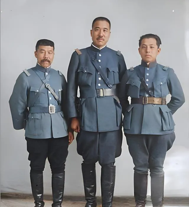 这张三人合影,居中者个子最高,制服是海蓝偏灰的呢布,胸前斜挎带压得平整,肩章两端有磨得发亮的金属扣,左边那位络腮胡收得干净,右边年轻些,皮带孔位还带着新刻的棱角,三人脚下的长靴油得能照人,背景是素白墙,老派照相馆最爱用这一手,省去杂念,只留人和衣的硬挺。