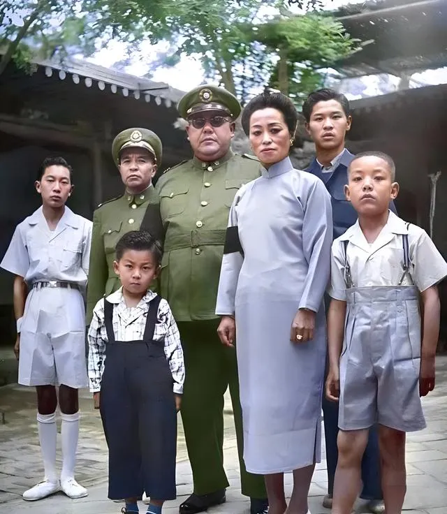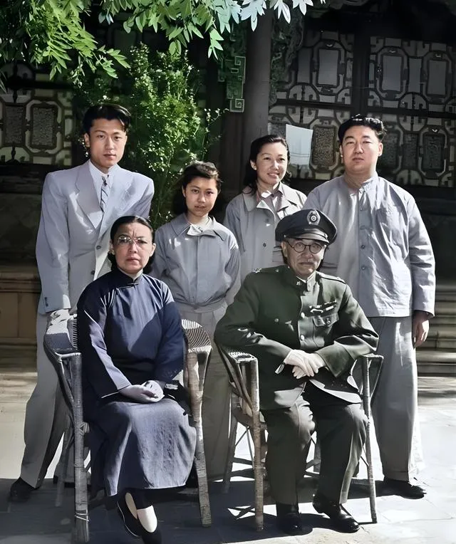 这张取景几乎在同一处,枝叶从画面上方垂下来,像一帘子,把院子分出明暗,前排两把竹椅,一位披深青长袍的女士端坐,手套白得发亮,另一把椅子上还是那身军装,腿边压着文件夹,后排四个年轻人站成弧形,小姑娘的短发刚到耳下,衣襟用暗扣压住,笑意浅浅的,像藏在衣缝里不肯跑出来。