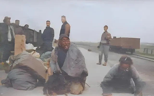 图中这两位跪在地上的,是当年沿河逃荒来的灾民,麻灰色的破毡披在肩上,边角都卷起了毛刺,手里攥着个小碗,向过路人讨口吃的,奶奶说这阵子要是遇上热心人扔几块馒头碎,他们能乐半天,现在车站候车厅亮堂又暖和,拿着咖啡刷手机,那时候人守的只是风口里的一点活路。