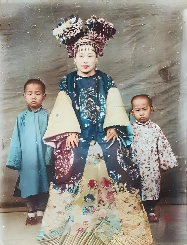 图中这位穿绣蟒袍的贵妇头上戴的是钿子,黑绒为胎,缀上银丝铜丝再点宝石珠花,前额还压着几缕流苏,走动就轻轻抖一抖,旁边两个小娃站得直直的,像在学规矩,妈妈看了笑我,说别光看亮闪闪的,背后可都是绷带子勒出来的挺拔。