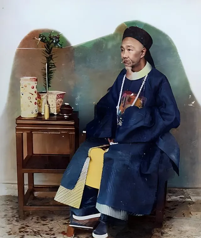 这一位坐在花木前的,是清末的高官个人像,缎面蟒袍光泽发亮,脚下厚底靴衬得人更稳,案几上摆着瓶花与器物,姿势端正却透点疲态,另一张换成素色背景,旁边放了牙白的数珠与茶罐,讲究的是体面与分寸,现在拍证件照讲究像素和补光,那时讲究的是身份与排场。