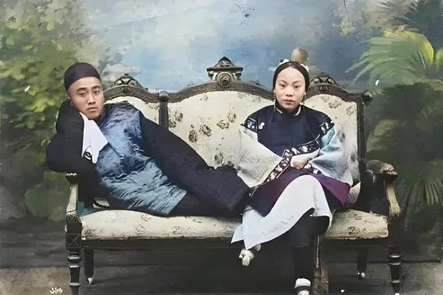 这对坐沙发的年轻人,姿态挺自在,先生斜靠一角,夫人脚尖一挑,绸面衣料在灯下泛光,摄影棚背景画着树影楼阁,像是把理想生活贴在身后,妈妈看完说,嗯,有点小洋气,当年时髦的人都去照相馆留念,现在手机里几十张合照一眨眼就翻过去了,那时一张就够讲好多年。