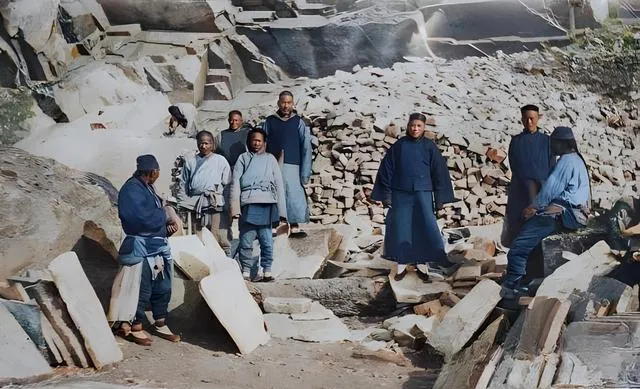 这堆白石当背景的,是海州的石料场,伙计们停下手,衣襟上全是石粉,脚边放着錾子和楔子,脸上写着累,却也往镜头凑了凑,像第一次打量照相机,爷爷说石场的活最磨劲儿,榔头一口一口砸,天亮到天黑都躲不过手心起茧。