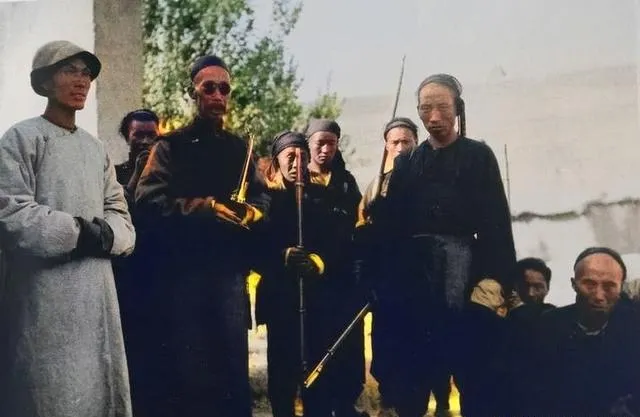 图中这拨人是地主出门时带的家丁队,手里攥的长枪冰冷发亮,枪托裹着布防磕碰,胳膊上还缠着粗布护腕,头上清一色的瓜皮帽和包头,黑袍子在日头下一点反光都不肯给,神情全是打点江湖的那股子硬气,老照片里最扎眼的不是枪,是站位,前后左右留着空当,像极了我小时候看村里红白事请壮汉护送的阵仗,奶奶就嘟囔,这阵势是“宁可多一步排面,不可少一分安生”,那时候有家丁才敢远行,现在坐高铁刷个码就到了。