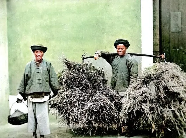 清末老照片:地主出行家丁沿途警戒护送,挑柴老汉,清军弓箭手。