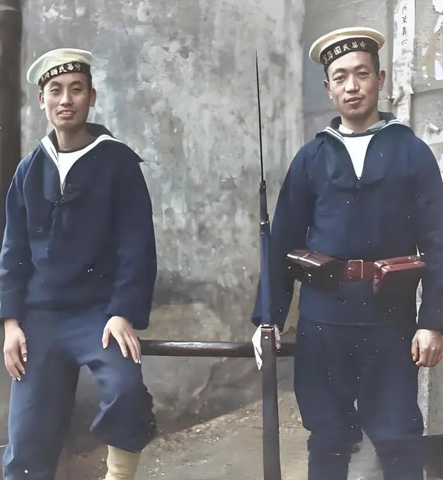 图中这身制服叫水兵服,呢料发蓝,翻白边的领子往下一折很精神,帽沿上烫金的“中华民国海军”四个字正亮,左边这位把绑腿扎成了浅色,右边则是深色一体看着更整齐,岸勤枪架着,腰间皮质弹壳盒泛着油光,年轻人脸上有股子轻松劲儿,可站姿一到位,军味儿立刻就来了。