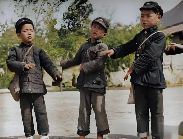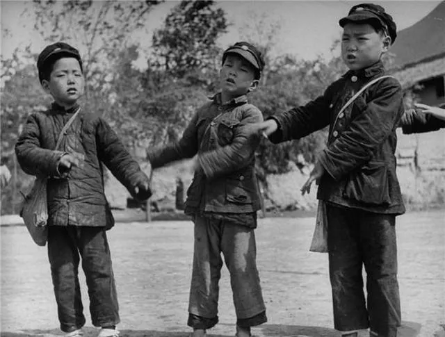 这个场景叫学童唱队,三个孩子把手比划着拍节,棉襖鼓鼓囊囊,帽檐压得低,嗓门倒不含糊,左边那位背着小布包,像是刚从课堂里被老师点名出来表演的,乡亲们常说,小孩儿记词快,调门子准,放学路上还能一路唱回家。