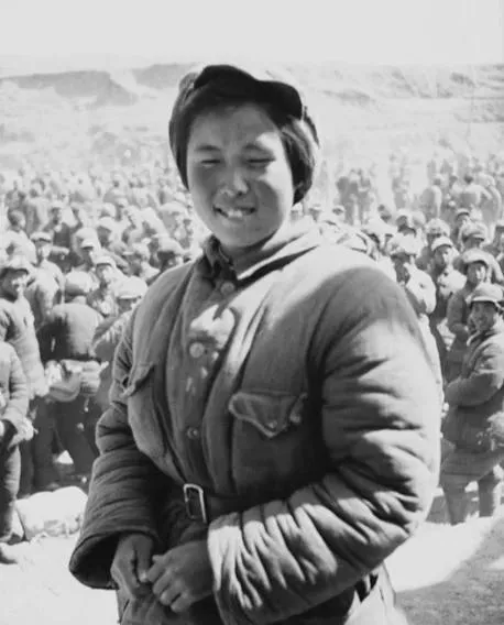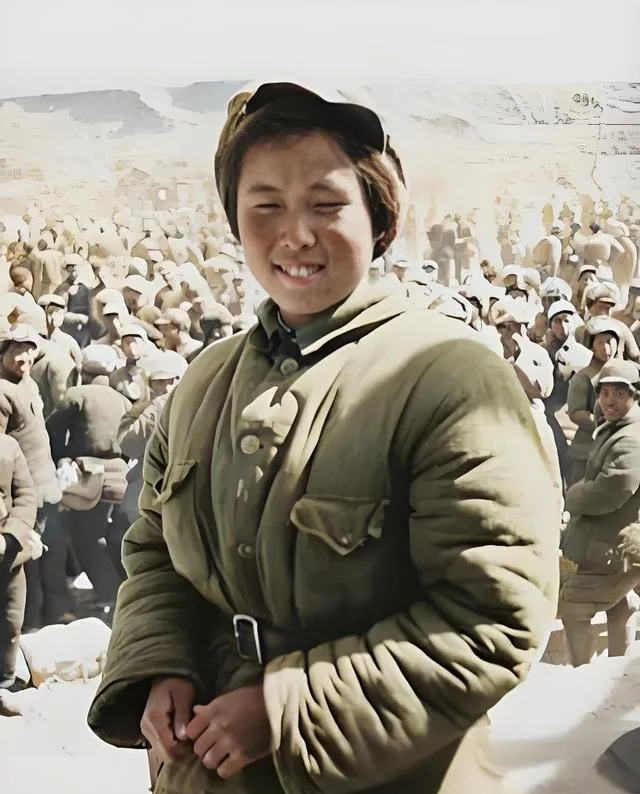这个笑得亮的姑娘是八路军通讯或文宣口的年轻战士,厚棉军装把身量衬得结实,腰带扣子反着光,身后站成一片的是大会场的人群,风从黄土高地刮过来,脸被吹得泛红,她冲镜头一乐,像刚从队伍里跑出来递话,利索又痛快。