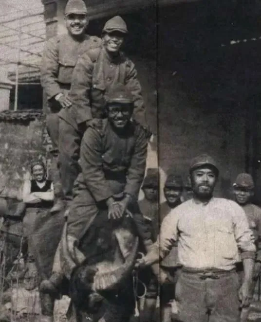 这张里头是被掠走的水牛,几名鬼子挤在牛背上,笑得刺耳,牛眼往旁边躲,蹄子打滑,周围还站着起哄的同伙,乡下人都知道,水牛脾气温顺,给田地出力最老实,换成现在,说一句**“兽性不在牛身上”**也不为过。
