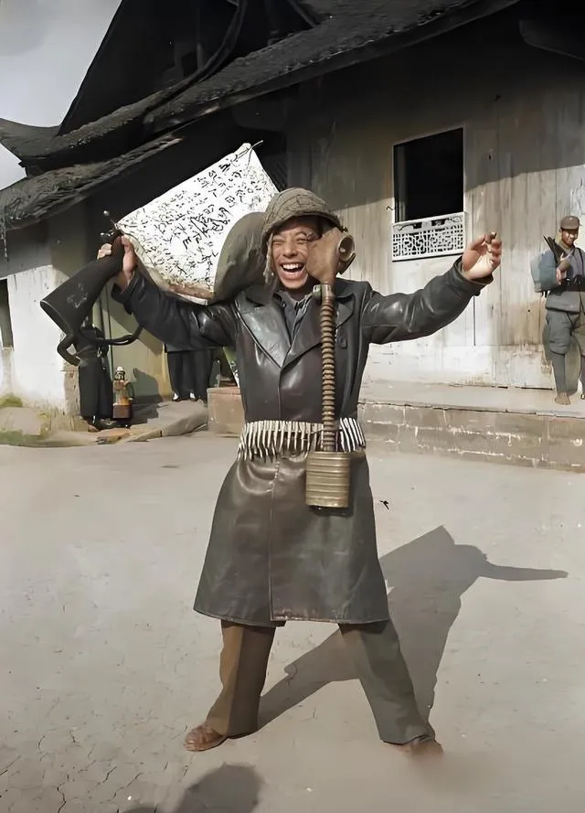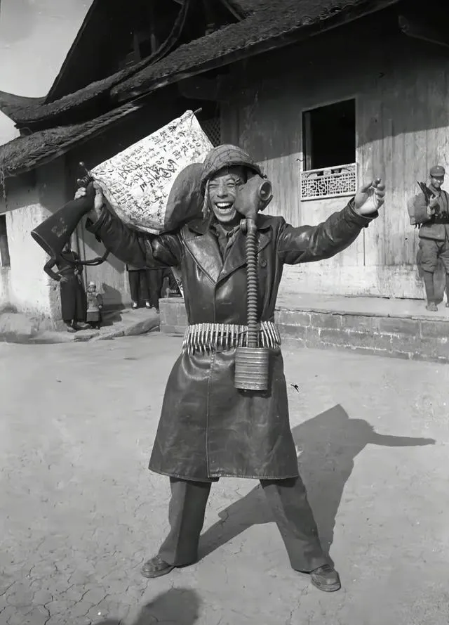这个皮大衣小伙儿手里拎着日军防毒面具,胸前挂着一溜子弹带,肩上扛着写满字的缴获物,笑得见牙不见眼,空气里仿佛都扬起了尘土的甜味儿,他把胳膊一张,说白了是想把**“赢了”**两个字抛给所有人看,拍这张的人大概也笑弯了腰。