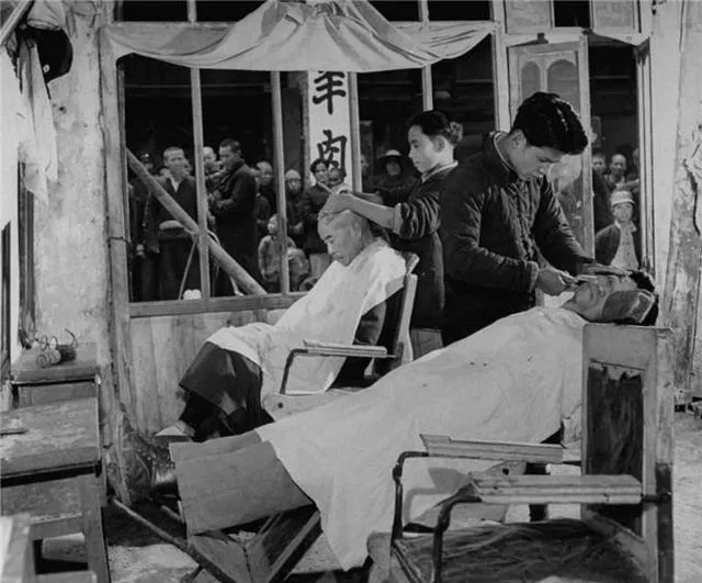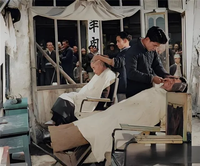 这个铺面叫剃头挑子进屋版,两把躺椅一前一后,白围布裹得紧,剃刀在下巴上轻轻拂,门口人挤着看热闹,窗纸边缘卷起一角,里头的**“羊肉”**字样招牌挂在对面,仿佛一转身就能闻见锅里的香味,父亲当年最讲究出门前刮个青胡茬,说脸面干净,碰谁都硬气。