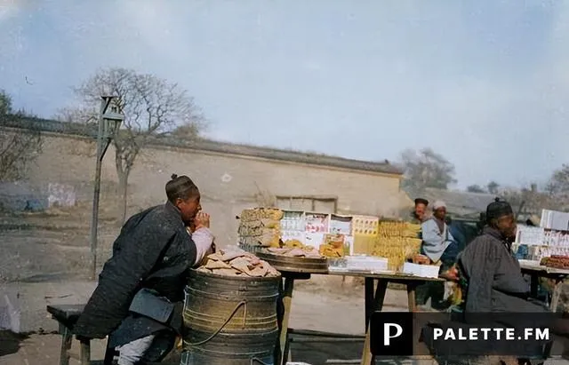 画面里这些人叫小贩,身上粗布棉袄,袖口塞草絮,蹲着的那位叼着根秃烟杆,身后桌上摆的全是零吃,芝麻饼子和硬面窝头颜色黄里透灰,风沙一刮,纸包子全响,小时候跟着大人买半块驴打滚,一边走一边吃,芝麻掉一路,狗在后头追着闻。