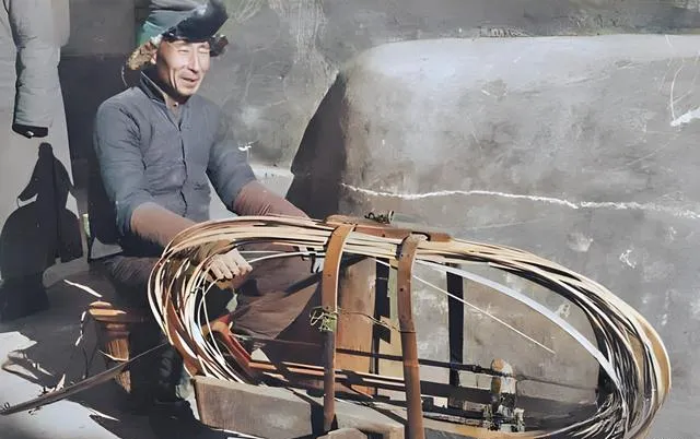 。图中这位手里转着的弯条叫竹篾,他脚边那台木架子是弯条机,木槽里压着铁夹和小滚轮,竹篾从水里泡软了绕上去,手一拽脚一蹬,哧溜一圈,弧度就收住了,边上那两道皮带是为了把弹劲儿摁住,省得竹子弹脸上。我小时候在屋檐下看过,师傅用牛油抹刀口,说这玩意儿不抹油不行,竹子会起毛刺,做成的簸箕边必须光,扔米才顺当,现在买个塑料筐就完事儿了,可那股竹香,再贵也买不回来。