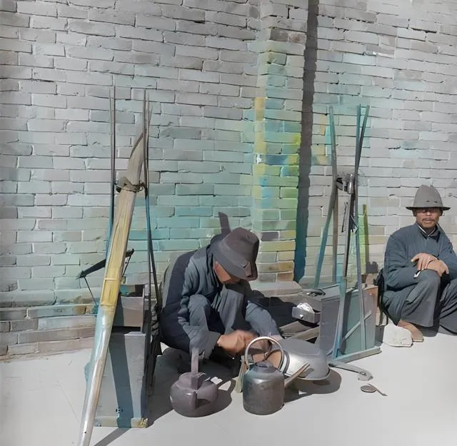 。这个排得满满当当的叫洋铁壶,小口大肚,黄铜的漏斗挂在边上,太阳底下闪得人眯眼,摊主嘴里叼着小哨,唧的一声,巷子那头就有人回头,小时候我被那一串光吸住了,伸手摸冷冰冰的,掌心留下一股金属味。以前家家烧水靠壶,现在一台热水器把事情全包了,锅碗瓢盆也少了声响,家里安静了不少,却也少了烟火气。