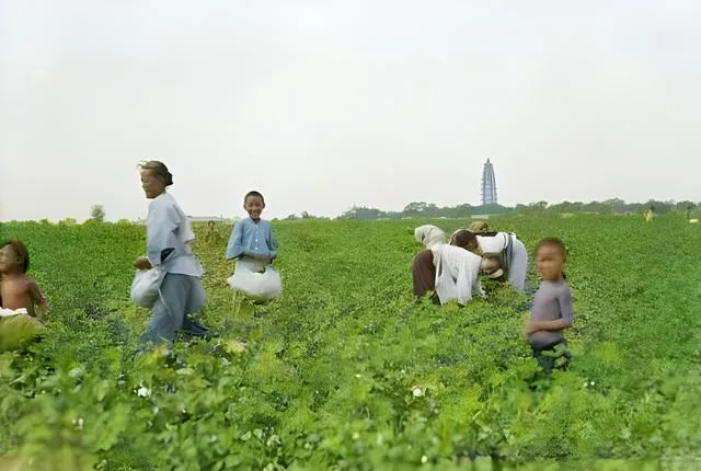 这个景儿在郊外,绿汪汪一片,图中孩子们把白软的棉絮攥在怀里,布袋鼓鼓囊囊的,远处塔影直直立着,我们小时候去帮着摘花生叶,上手和这个差不多,指甲缝里全是青汁,回家奶奶用温水泡一泡,才洗得掉,那时候忙完一地活,晚饭就格外香。