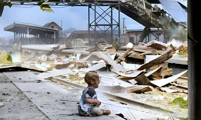 这张不敢多看,地上是碎铁和断木,台面塌了一半,角落里一个小孩坐着,衣服灰白,脸也灰白,眼神发直,你以为他会哭,可他像是连哭都不会了,照片不过一瞬,人心却咯噔一声沉到底,我们说起和平总嫌太大,其实就一句话,孩子该在家里睡午觉,不该在废墟边上发呆。
