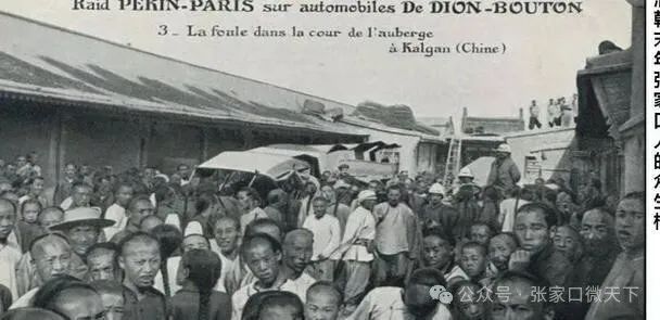 1907年巴黎至北京汽车拉力赛,经过张家口,人们涌到俄国驻张家口领事馆观看新鲜玩意汽车。