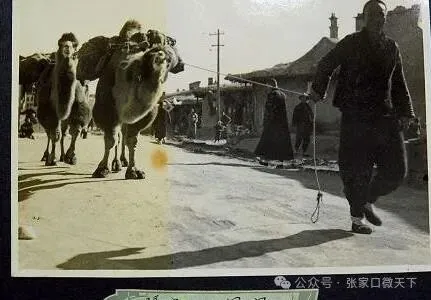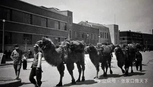 民国时期,中央大街上的骆驼商队,街道规模和小楼是大城市。