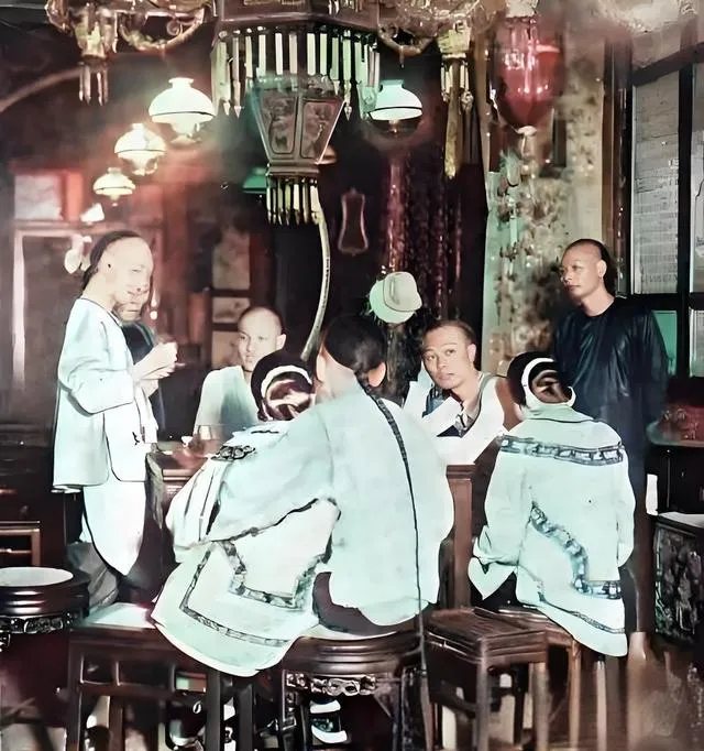 图里这桌人叫个阵仗,圆凳擦得亮亮的,罩着玻璃灯的厅堂里挂满流苏,几位衣衫考究的男子围着桌沿,一把叠扇,一杯老酒,腰间的玉坠子在灯下打着小光,旁边坐着两位打扮齐整的姑娘,眉眼笑着,心里却不一定欢,奶奶说,那会儿有钱人讲究的是排场,酒要温着上,菜要一波一波来,唱一曲小调,再掸一掸袖口上的灰,算是有体面的人了。