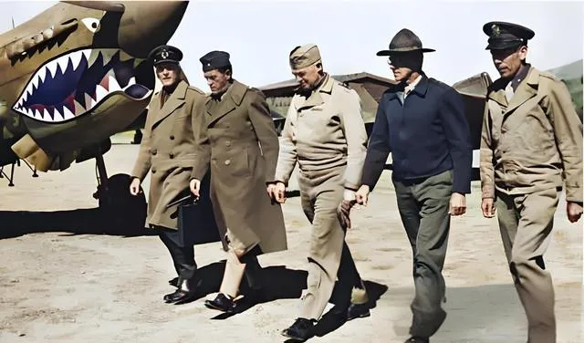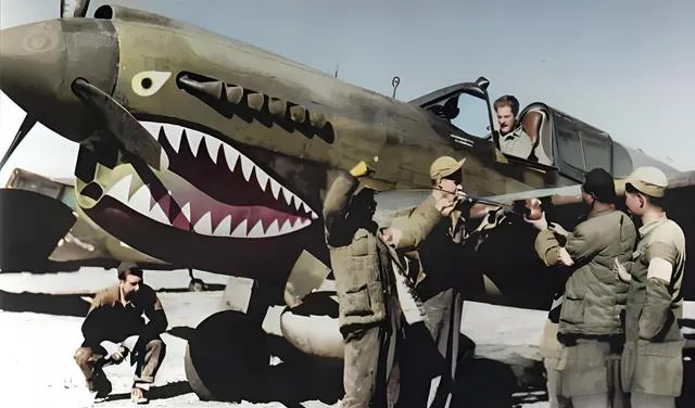 这个涂成大嘴牙的是战鹰,机鼻画了鲨鱼嘴,齿缝里红舌头亮得扎眼,机务们围着螺旋桨忙活,拆一颗螺丝,递一把扳手,地上有人半蹲着照灯,手背全是油,咯的一声,机盖合上,像扣住一口铁锅,照片另一张,几位穿呢大衣的从机翼旁走过,帽檐压得很稳,步子也稳,谁都知道,这些人一挥手,地面要忙半宿。