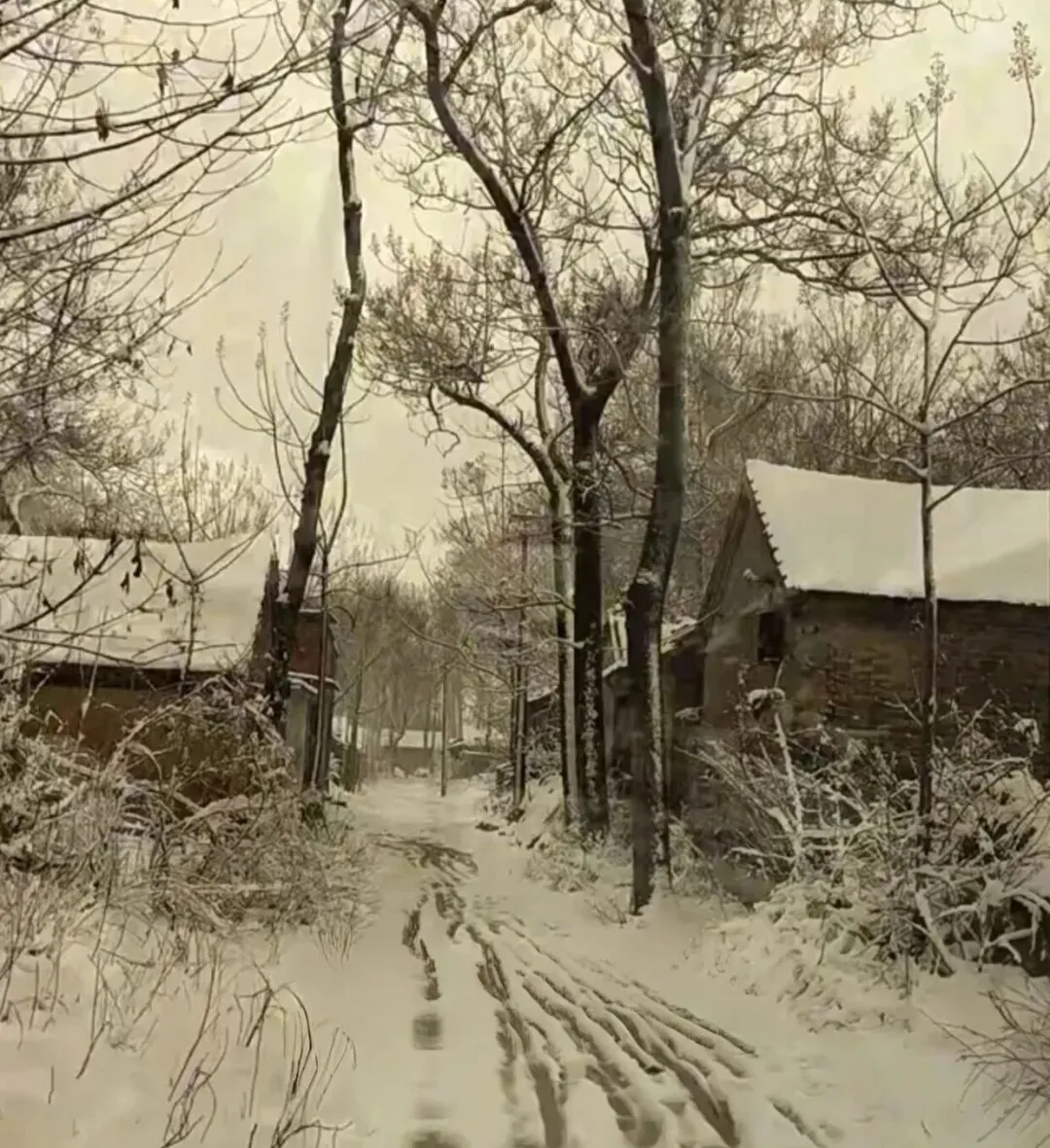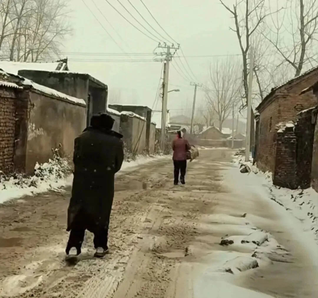 两侧低矮的砖房,屋顶残雪,枯枝割裂天空,电线横斜交错——这就是无数人记忆里老冬天的模样:清寂、朴素,却充满了扎实的生活痕迹。而那条被大雪覆盖的蜿蜒村路,更像一幅宁静的水墨画。雪压柴扉,雾锁寒树,整个世界仿佛都睡着了,只剩下一行孤独的脚印伸向远方。这景象让我想起诗人写的:“柴门闻犬吠,风雪夜归人。”那种静谧,不是空虚,而是一种饱满的、属于土地的安宁。