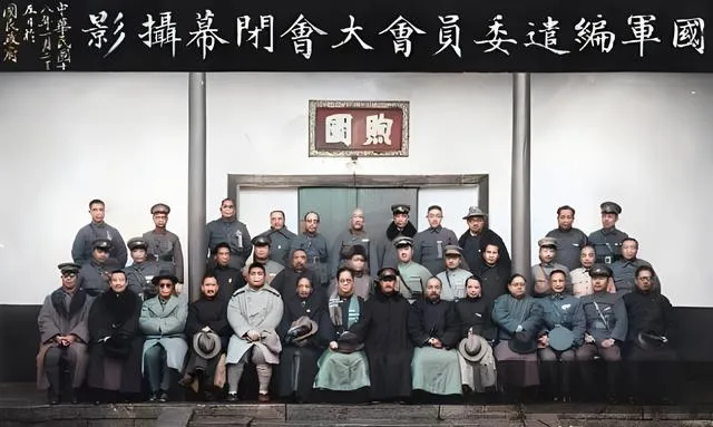 这个大合影叫编遣委员会闭幕留影,门楣上“国敌”二字映着漆黑的横匾,穿呢子大衣的与披棉袍的坐一排,帽子都拢在膝上,表情各不相同,冷着脸的多,笑的少,照片乍看平静,其实背后全是算盘珠子在拨动,谁的兵裁多少,谁的饷从哪拨,谁的位置往里挪一格,奶奶说,那个冬天城里风很硬,来开会的人把帽檐压得低低的,现在我们说机构改革讲流程和公示,那时候呢,半张纸一行字,能让一个军的命运拐弯。