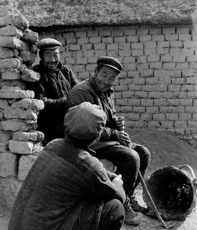 照片里的场景叫墙根闲谈,三个人蹲一坐一靠,草帽放脚边,筐口歪歪扯扯,话题从收成扯到谁家鸡下蛋,笑纹挤到眼角里,那是真会聊啊,一聊能把寒风聊暖和。