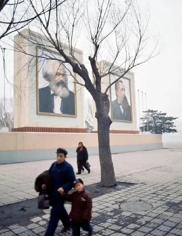 这两幅高高的叫大道画像墙,树枝光秃秃,风从空地刮过,父亲牵着小孩快步走,口袋里揣着饭盒和钢笔,路边砖缝里有水渍,天冷,脚跟敲在地砖上叮当响。