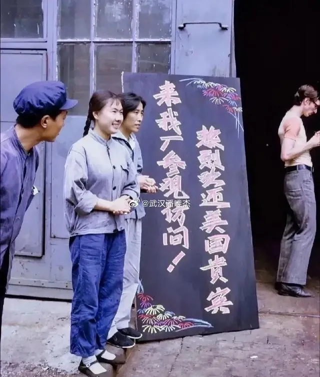 黑板上粉字鲜明的叫欢迎牌,小姑娘扎着麻花辫,袖口挽到小臂,笑得直露虎牙,旁边的师傅把门半掩着看热闹,厂里来客参观,车间擦得亮堂堂,奶奶小声说,别紧张,笑就行。