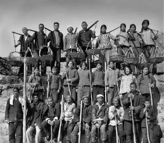 肩上扛杆手里拿镢的叫荒滩造田,一字排开照合影,篮筐吊在木担上,脚下是刚翻的土坷垃,女人男人都勒着腰带,脸上有风,有土,也有不服输的劲儿。