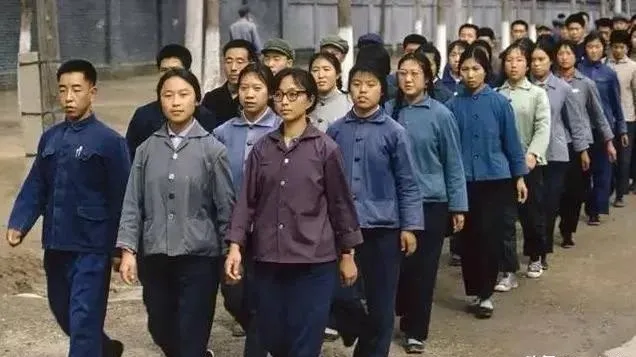 这一队蓝紫灰的叫招工或训练队列,步幅齐,目光直,前头的戴着黑边眼镜,嘴角抿得紧,旁边有人悄悄数拍子,节奏一扣住,整条路都显得精神,跟现在上下班的散漫劲儿不一样。