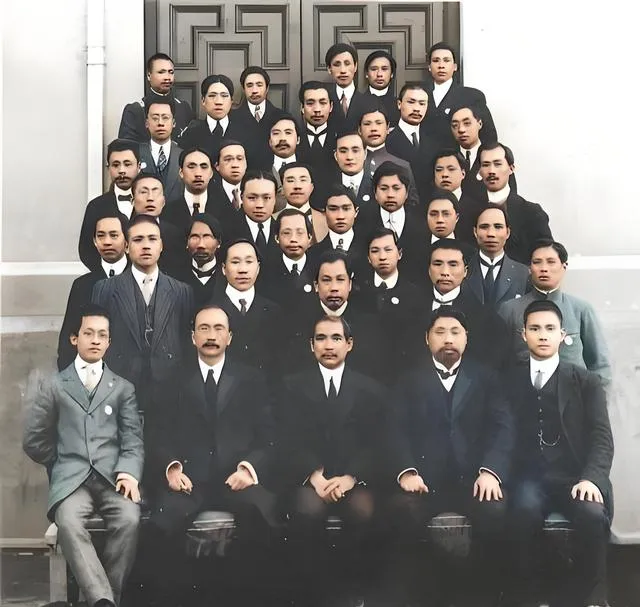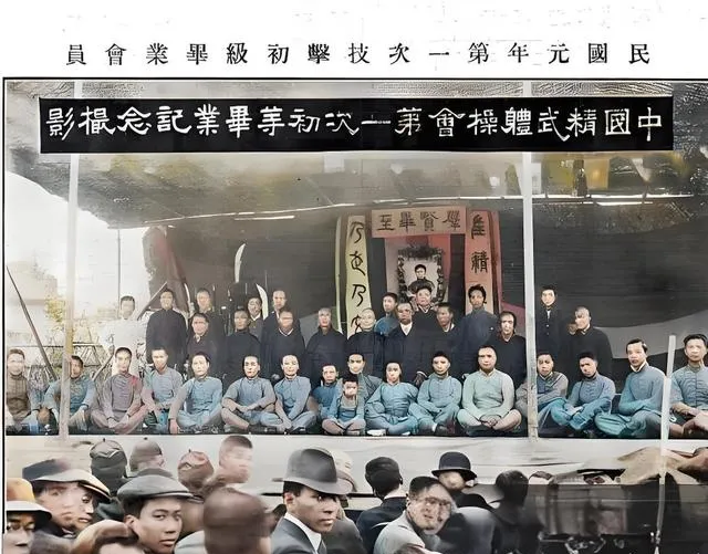 图里的这群人叫精武体操会首批毕业生,长衫对襟,蓝灰为主,台上挂着“尚武”“爱国”的字幅,记得老师提起时总说一句,练武先立德,前排坐得直,手背压在膝上,眼神朝前不闪,像是把镜头当成未来在看他们,妈妈瞧见这张彩照会感叹,咦,原来布的颜色这样温和呀,黑白那张一对比,气质更沉稳些。